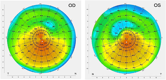 Figure 3 show his corneal topography images from just prior to the procedure. We observed that after the procedure, his corneal topography changed over approximately 10 to 12 months before it stabilized. It is important to note that the flattening that we initially observed did not remain, and ectasia was evident in recent Pentacam (Oculus) anterior segment tomography images (Figure 4). Figure 5 shows the Pentacam Scheimpflug and three-dimensional (3D) modeling images, which were also taken 18 months after the procedure.