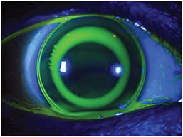 Next, you need to establish what OCR lens designs to prescribe. Some designs use a completely empirical fitting philosophy, some use diagnostic/dispensing systems, some use traditional diagnostic lens fitting, and others are based totally on topography. Figure 3 shows the fluorescein pattern of a well-fit OCR lens. The system you use will dictate whether you are able to dispense lenses at the time of initial fitting or whether each lens is custom-ordered to be dispensed at a subsequent visit. Each system has pros and cons that you should discuss in detail with experienced practitioners and/or laboratory consultants to help you decide which is best for your office.