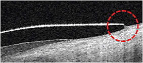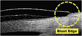 As an example, Figure 11 shows a scleral lens edge sinking into the conjunctiva at the tip, causing a constriction of vessels visible with the slit lamp. The OCT image shows us that the shape of the alignment zone and edge are without defect; however, the angle of the landing zone should be increased to create more edge lift and to better accommodate the flatter scleral surface angle.