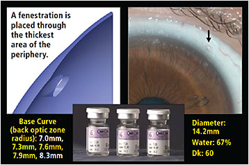 A 32-year-old patient was referred to us with the diagnosis of keratoconus and GP lens intolerance. At that time, we fitted the patient with the Soft K lens from the 14.2mm, three-lens diagnostic set, which has radii of 7.30mm, 7.60mm, and 7.90mm; it is also available in radii of 7.00mm and 8.30mm. The lenses were manufactured in the Contamac Definitive silicone hydrogel material with a Dk of 60. The lenses incorporate a fenestration in the midperiphery to control the fluid pressures present beneath these thicker lenses (Figure 1).