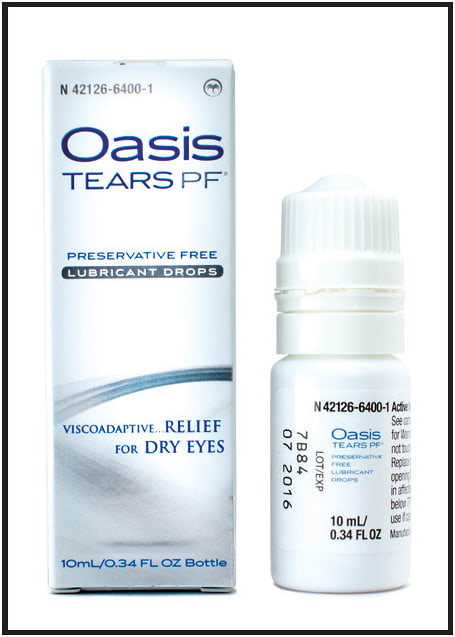 Oasis Tears PF preservative-free lubricant eye drops are packaged in an ophthalmic multi-use bottle that prevents contamination through the use of a patented closing tip, valve, and air venting system that the company says prevents microbial entry into the bottle. This propriety system keeps Oasis Tears PF sterile for up to 90 days after opening, according to the company. Call (800) 528-9788 or visit www.oasismedical.com.