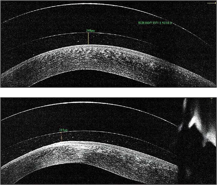 Figure 1. OCT image of a scleral lens fit on a patient who has keratoconus, horizontal line scan (top) and vertical line scan (bottom). The cornea is the opaque white band located at the bottom of each picture, the tear film reservoir is the middle clear band, and the contact lens is the top band. Using an electronic caliper tool, the precise amount of vault can be measured, leaving no doubt as to the precision of the fit.