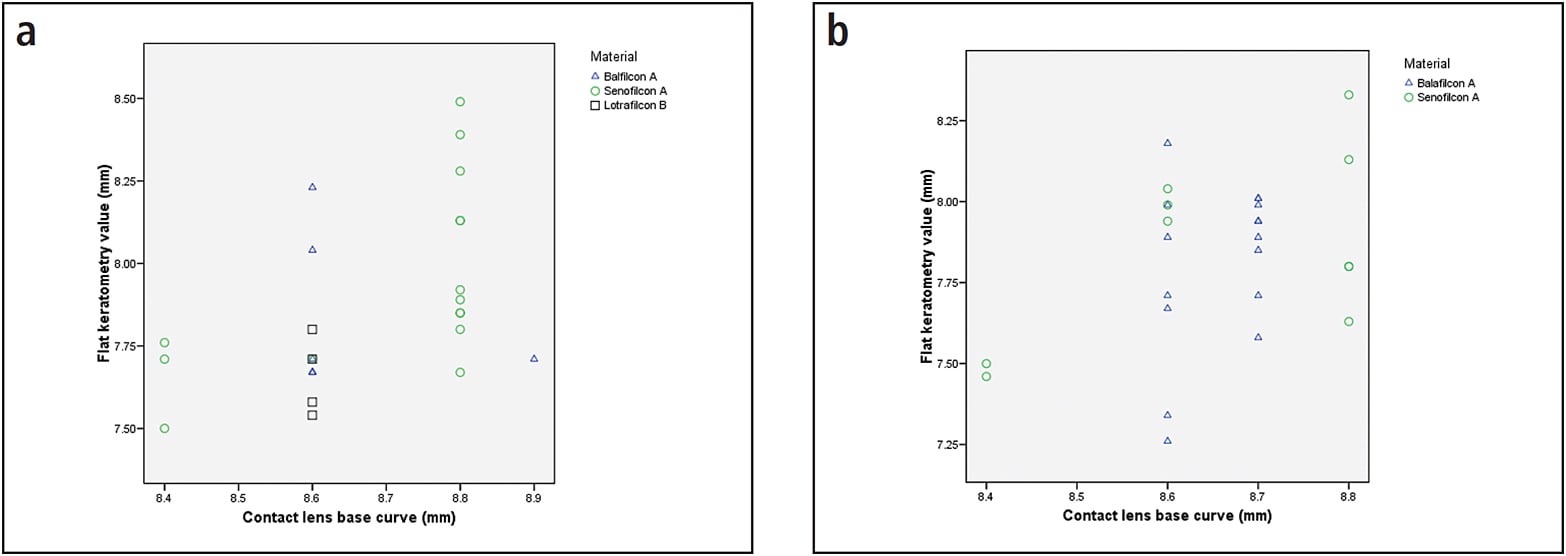 Figure 1. The flat corneal keratometric values versus contact lens base curve selection among (a) new fits and (b) refits.