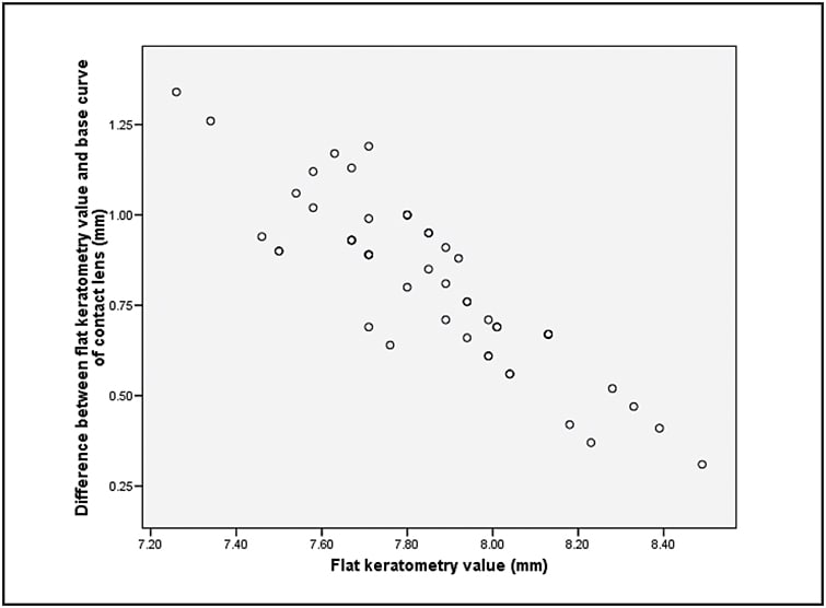 The average amount of flattening from flat corneal K values for the base curve of the prescribed lens was 0.83mm ± 0.23mm in both new fits and refits. There was significant negative correlation noted between the amount of flattening and the base curve of flat K values (Pearson correlation coefficient r = –0.876; p = 0.0001) (Figure 2).