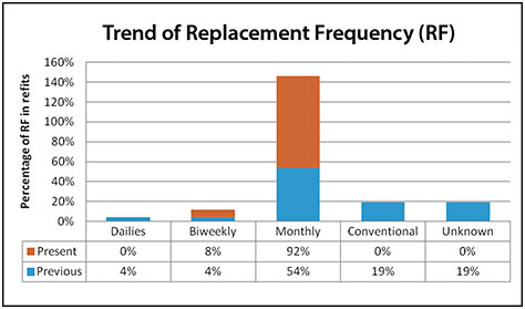 The shift in replacement frequency among the refits could be explained by factors such as: 1) promotion of frequent replacement lenses by practitioners explaining the possible risk of developing adverse events; 2) patient preference for better maintenance of ocular health; and 3) increased availability of monthly replacement lenses in the market influenced by global studies. A higher frequency of monthly replacement contact lenses was also observed in other studies (Morgan et al, Aug 2010; Thite et al, 2013; Sanker and Noushad, 2013; Efron et al, 2010; and others.).