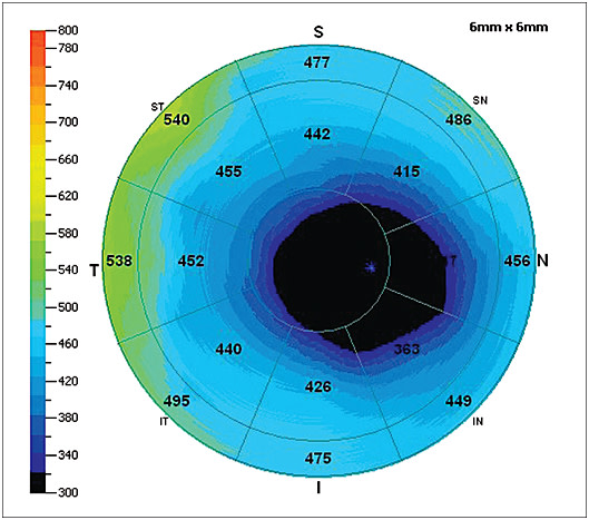 Other methods that have been used and correlated with the severity of keratoconus include parameters related to the anterior limiting lamina or Bowman’s layer. High-resolution OCT demonstrates that the average and minimum anterior limiting lamina, as well as an index that compares the inferior anterior limiting lamina minimum thickness to the mean superior anterior limiting lamina thickness, correlate well with the severity of the keratoconus (Abou Shousha et al, 2014). The central and cone apex corneal thickness should be monitored in grading the severity of keratoconus. In addition, the peripheral corneal thickness also should be assessed (Brautaset et al, 2013).