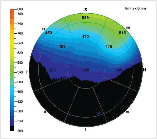 Staging of keratoconus using a Fourier domain OCT has proved useful in identifying stages of keratoconus (Sandali et al, 2013). However, this staging is more grossly accomplished and may not be as useful as other grading systems. It encompasses thinning in stage 1 to scarring and hydrops in stages 4 and 5. Elevation corneal maps also show changes in anterior and posterior elevation differences that can be correlated to the severity of keratoconus (Ishii et al, 2012). Table 1 provides a platform for grading the severity of ectasia.