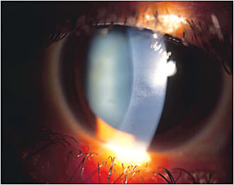 Recent information on the biomechanical attributes of the keratoconic cornea have indicated that certain parameters decrease as the severity of the keratoconus increases (Viswanathan et al, 2015). The Contact Lens Evaluation in Keratoconus (CLEK) Study developed the Keratoconus Severity Score (KSS), which included clinical signs such as Vogt’s striae, Fleischer rings (Figure 4), and corneal scarring as well as the mean corneal power and root mean square of the higher-order Zernike polynomials (McMahon et al, 2006).