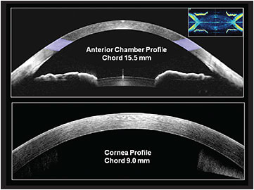 Historically, OCT instruments that could provide these functions were costly, and their use was therefore limited to research centers only. However, Carl Zeiss Meditec now offers the Anterior Segment Premier Module, which converts its posterior segment Cirrus HD-OCT family into anterior segment devices. The module uses two external lenses: the anterior chamber lens provides a wide-angle view (out to a 15.5mm chord), while the cornea lens provides a high-resolution view of the cornea over a chord of 9.0mm (Figure 1).