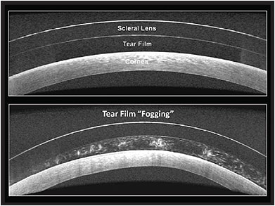 Figure 3. A scleral lens patient who has no post-lens fogging (top) and a patient who has symptomatic fogging (bottom).