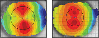 Figure 1. Limbus-to-limbus astigmatism (left) is more likely to need a toric base curve compared to central astigmatism (right).