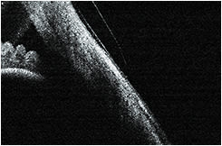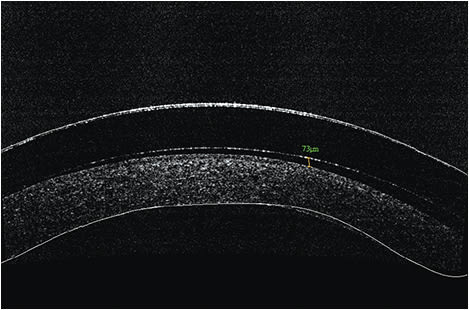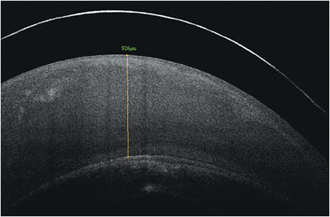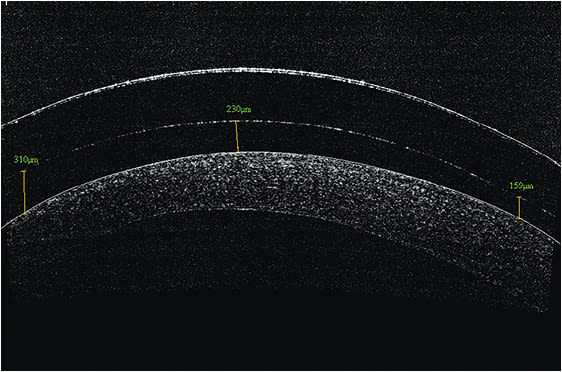 Alternatively, anterior segment optical coherence tomography (AS-OCT) can be used to precisely measure scleral lens vaulting at any point beneath the scleral lens and can also be used to evaluate the landing zone over the bulbar conjunctiva/sclera. You can determine the appropriate vault over the cornea by selecting the appropriate sag of the contact lens and measuring the post-lens tear film.
