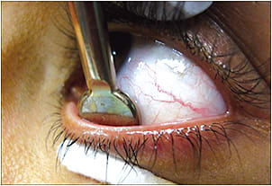 The Mastrota paddle is designed to gently express meibum from the MGs (Figure 2). The Mastrota paddle can be positioned behind the eyelid parallel to the glands. Gentle digital pressure, or pressure with a cotton-tipped applicator, on the outer lid prompts meibum secretion. This procedure can be carried out with or without anesthesia. This tool can be useful in examining MGs and grading MG function. (To view a video of a Mastrota paddle in use, click here.)