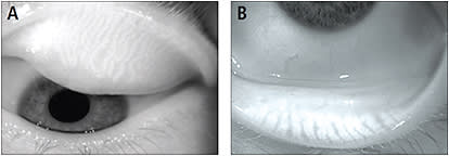 Figure 5. The meibomian glands in the upper eyelid (A) and in the lower eyelid (B) taken by the infrared camera of the Keratograph 5M. (Images provided by the CCLR, University of Waterloo.)