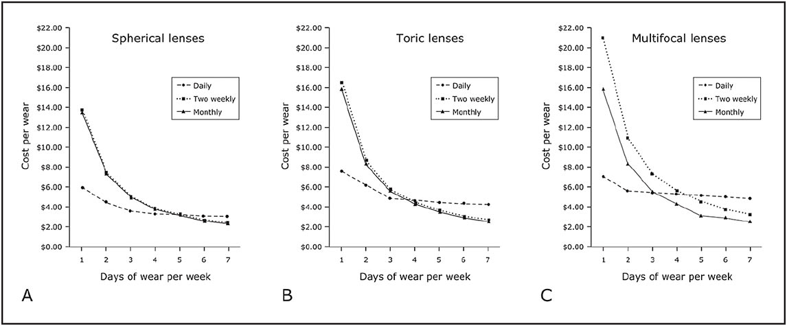 Figure 1. The cost per wear of A) spherical, B) toric, and C) multifocal contact lenses when worn various days per week. The values calculated for daily, two-week, and monthly replacement lenses assume compliance with care and replacement schedules and include cost of care solutions, contact lenses, and professional services (Efron et al, 2010). Reprinted by permission of John Wiley & Sons, Inc.