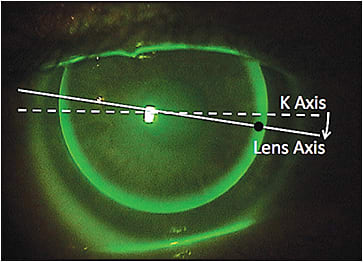 Because the base curve is toric, when these lenses rotate, the tear film power does change, and that makes the optics a bit trickier to calculate. The tear film and the lens both have a cross-cylinder effect. Fortunately, the effect of all of this is easy to predict.