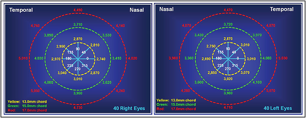 Various studies have highlighted the scleral profile’s asymmetric nature (Hall et al, 2011; Hall et al, 2013; van der Worp et al, 2010). A recent study by Ritzmann et al (2015) at Pacific University evaluated the scleral profiles of 40 normal healthy subjects (80 eyes) using the Eye Surface Profiler (Eaglet Eye), an instrument capable of imaging the sclera to a width of up to 20mm. Measurements of scleral sagittal depth, referenced from the apex of the cornea, were taken in the primary and oblique positions of gaze at chords of 13.0mm, 15.0mm, and 17.0mm. Their results showed marked asymmetry 360º around the scleral faces, but also marked differences in sagittal depth between opposing faces in the horizontal and vertical meridians, with the nasal and superior faces exhibiting the least scleral sagittal depth (i.e., protruding anteriorly the most) in each case (Figure 5). Importantly, however, the disparity increased significantly with the increase in chord diameter, especially along the horizontal meridian.