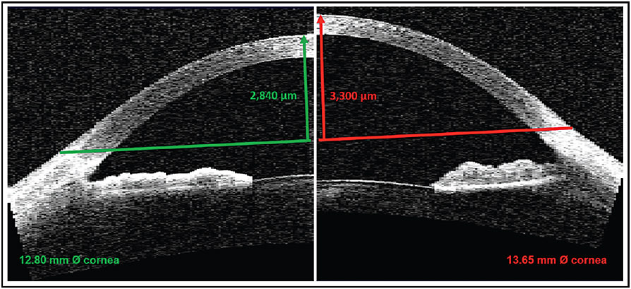 A “typical” eye with an HVID of 11.90mm, radius of curvature of 7.85mm, and an eccentricity of 0.55 (and assuming a scleral radius of 18.0mm over a 15.0mm chord) would have a theoretical ocular sagittal height of 3,150 microns. A variation in corneal diameter of only 1mm either way results in very different sagittal heights of 2,880 and 3,510 microns for corneal diameters of 10.90mm and 12.90mm, respectively—a difference of approximately 630 microns between the two extremes. Figure 3 shows differences in sagittal height for two corneas of the same radius of curvature but differing corneal diameter.