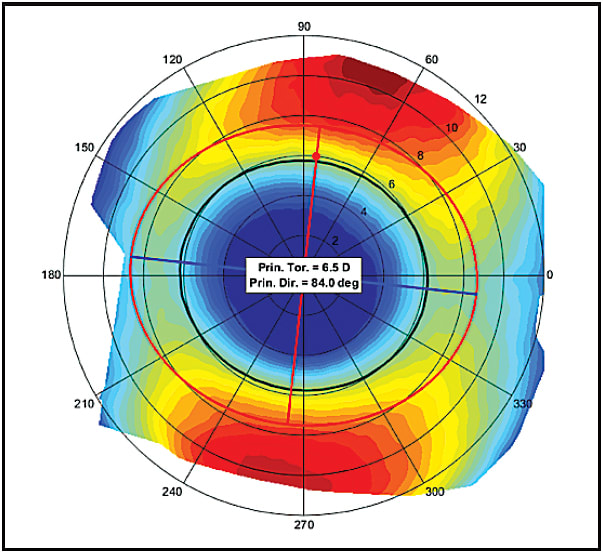 Figure 1. This images shows 6.50D of with-the-rule scleral astigmatism measured at a 16mm chord.