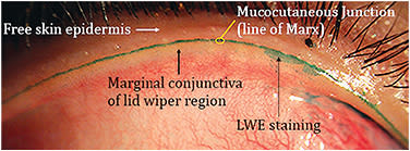 The anatomy of the lid wiper region has been well described (Knop E et al, 2011). The human eyelid margin is divided into three histological zones: the free skin epidermis; the mucocutaneous junction, which corresponds to the line of Marx; and the marginal conjunctiva of the lid wiper region (Figure 1) (Knop E et al, 2011).