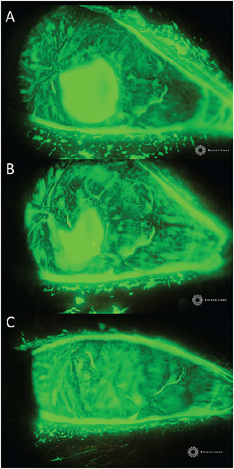 Figure 3. Persistent epithelial defect at A) day 1 (baseline), B) day 15, and C) day 16 after overnight wear with custom scleral device with daily clinical evaluation (including weekend days), removal, cleaning, disinfection, and reapplication with 1 drop of preservative-free Vigamox in the device reservoir.