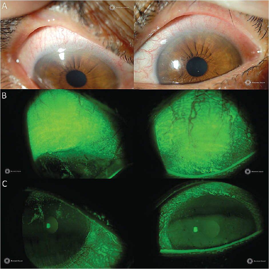 Figure 7. A) Conjunctival and perilimbal injection and redundant conjunctival tissue associated with SLK, B) superior conjunctival staining, and C) corneal staining and reduced tear breakup time, right eye more than left eye, respectively.
