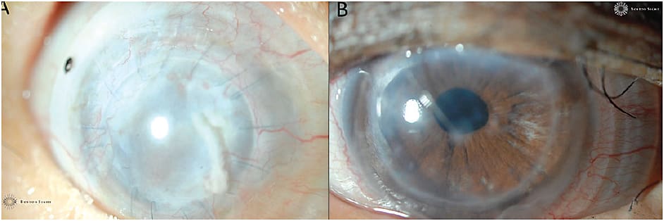 Figure 9. A) Right cornea and B) left cornea after penetrating keratoplasty (fourth OD and first OS) secondary to corneal perforation in a Stevens-Johnson syndrome patient with custom scleral devices in place.