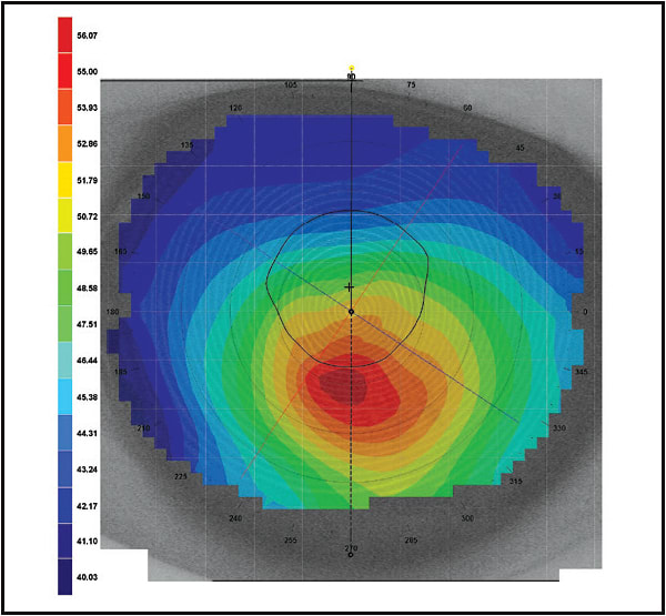 Let’s take another look at the keratoconus patient described at the beginning of the article. She exhibited many of the classic signs and symptoms of keratoconus patients even though she denied being diagnosed with the condition. She had gone through several pairs of glasses that didn’t seem to work, she had been fit with GP lenses that at some point had become too uncomfortable to wear. Although she was a young patient, her vision was reduced and could not be corrected to 20/20 with spectacles, no reflex was seen with retinoscopy, and she refracted with a high amount of myopia and some astigmatism. Topography measurements in the right eye were very steep and consistent with keratoconus, and her left cornea was so irregular that topography measurements couldn’t be obtained. She had small, steep cones that were slightly inferior of the visual axis. She had Fleischer rings and Vogt’s striae in both corneas.