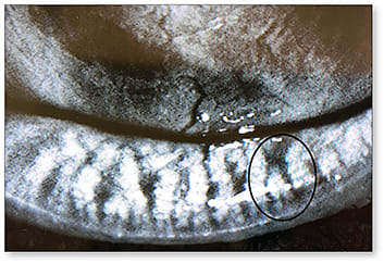 Figure 4. Meibography of early gland dropout of the inferior lid (circled).