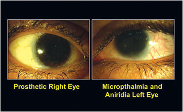 Figure 1. The patient’s right eye with an ocular prosthesis and left eye with microphthalmia and aniridia.