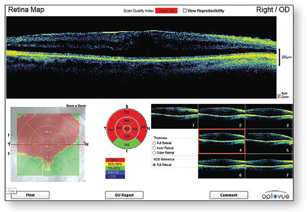 Upon application, he could still see only 20/200. Even over-refraction would not improve his vision. I dilated his eye, performed OCT on the macula, and discovered that he had progressed from dry macular degeneration to wet macular degeneration without knowing (Figure 1).