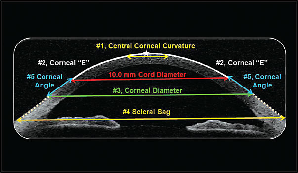 Our November 2012 column titled “New Thoughts on Anterior Segment Sagittal Height” described the five anatomical features that contribute to the sagittal height of the anterior segment: 1) the radius of curvature of the central (approximately 3.0mm) cornea, often referred to as “Central K”; 2) the midperipheral corneal eccentricity that extends from the apex of the cornea to a chord of approximately 8.0mm to 10.0mm; 3) the corneal angle, which begins at the 10.0mm chord and extends to the limbus; 4) the overall corneal diameter; and 5) the scleral angle that begins at the limbus and extends out to any given chord (Figure 1).