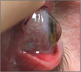 Corneal GP lenses are ideal for small, central cones or mild cones. A multitude of lens designs, including reverse geometry, exist in custom parameters with diameters ranging in size from 8.0mm to 10.0mm. If a patient has not previously tried GP lenses, I find it helpful to try a GP lens first. However, regardless of the way in which the lens is fit, GP lens wear at baseline is associated with incident corneal scarring (Zadnik et al, 2005). This converted to a 62% increase in an eye’s risk of scarring with GP lens wear in keratoconus compared with eyes that did not wear a lens.