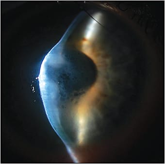 In advanced keratoconus, Munson’s sign is a V-shaped distortion of the lower eyelid caused by the ectatic conical cornea in down gaze. Acute corneal hydrops (Figure 2) are caused by sudden breaks in Descemet’s membrane accompanied by a sudden decrease in vision and corneal clouding due to corneal edema. Intrastromal clefts or blebs overlying the break may or may not be visible (Rabinowitz, 1998; Gomes et al, 2015). Subepithelial and anterior stromal scarring may be present, resulting from breaks in Bowman’s membrane. In the CLEK study, the incidence of corneal scarring in patients who had keratoconus was 20% (Wagner et al, 2007).