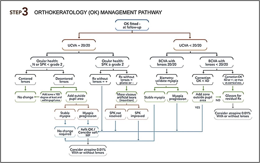 The Step 3 figure describes troubleshooting options relative to OK lens wear. If the results do not meet treatment goals, other options should be considered. Patients can be switched to multifocal soft lenses or be prescribed additional pharmacological treatment, such as atropine 0.01% (Chia et al, 2016). There are some gaps in the understanding of the favorable outcome obtained with anti-muscarinic drugs. For example, the application of atropine 0.01% stopped myopia evolution, but axial length still progressed, which raises questions about a potential rebound effect occurring. We would suggest that atropine may play a role with the crystalline lens, helping to balance axial length growth with the refractive power of the eye, which could limit this rebound effect.