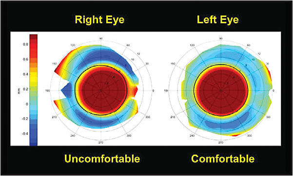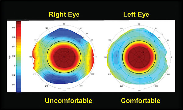 Our observations at Pacific University have shown the sclera to be both toric and asymmetric in the vast majority of normal and pathologic eyes. Therefore, when problem-solving patients who are experiencing scleral lens discomfort, a number of etiologies should come to mind: improper lens cleaning or handling; solution incompatibilities; inadequate or excessive clearance across the central, midperipheral, and limbal ocular surface; and the landing of a symmetric lens across a toric or asymmetric sclera.