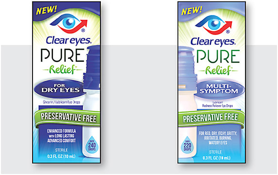 CLEAR EYES PURE RELIEF FOR DRY EYE AND MULTI-SYMPTOM ARE PRESERVATIVE-FREE DROPS IN A PROPRIETARY MULTI-DOSE BOTTLE.