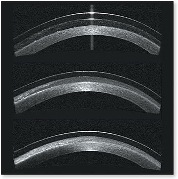 Figure 3. OCT image showing clouding progression under a scleral lens starting at baseline (top image), four hours (middle image), and eight hours (bottom image).