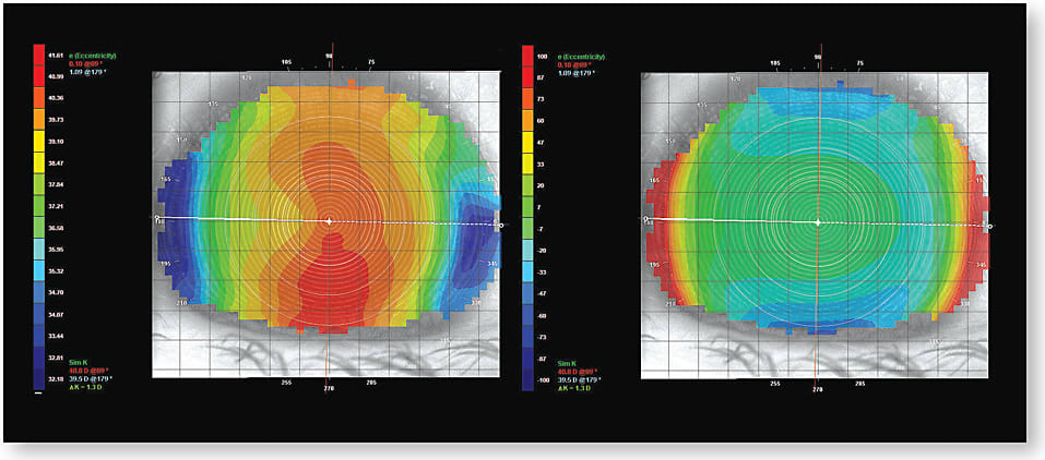 For example, a 26-year-old white male presented to the University Eye Center at the Michigan College of Optometry. He had a history of unsuccessful soft contact lens fits and discomfort, but no ocular pathology. He was interested in being fit with scleral contact lenses and stated that he had been hearing a lot of positive comments about them. Topographical imaging of the right eye showed 1.30D of limbus-to-limbus corneal astigmatism. When an elevation map was used to evaluate the height differences between the horizontal and vertical meridians of the right eye, a 200-micron difference was noted in the cornea between the two meridians (Figure 4).