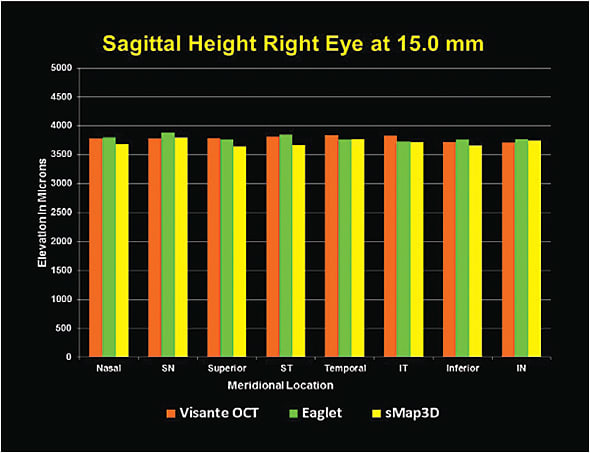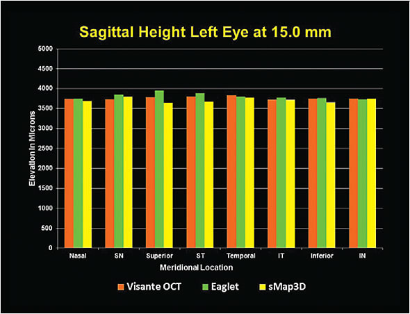 Figure 3 shows the right eye mean sagittal height results of the Visante, ESP, and sMap3D in the eight primary meridians: nasal, superior-nasal, superior, superior-temporal, temporal, inferior-temporal, inferior, and inferior-nasal at a chord of 15.0mm. Figure 4 shows the left eye data. The results of this 360° eye evaluation showed:
