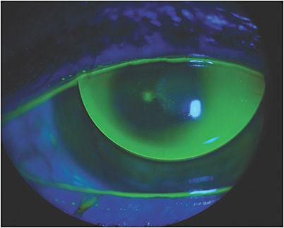 Fluorescein staining OD revealed an initial corneal abrasion (Figure 2) that would result in corneal erosion if lens wear continued. We also observed that she had a visual acuity (VA) of 20/25 OD with her current keratoconus GP lenses.