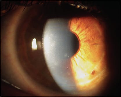 This image shows contact lens-associated infiltrative keratitis (CLAIK) in a patient’s left cornea. The 31-year-old highly myopic patient reported with recent bilateral irritation. He had been wearing PureVision 2 (Bausch + Lomb) on a daily wear basis using Opti-Free Replenish (Alcon) for overnight cleaning and disinfection.