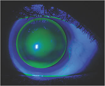 She received her lenses in two days and experienced nearly instantaneous adaptation, even in the left eye in which she had not worn a GP lens for nearly three months. Figures 5 and 6 show the left eye fit with this custom keratoconus design. She started wearing her lenses in early April 2019, and she recently sent us feedback that she had experienced no red eyes and no excessive tearing or any symptom that would indicate a compromised fitting.