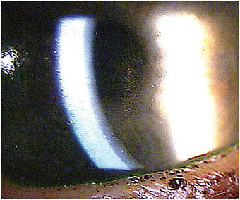 The fine vertical brown line on the posterior surface of this cornea is referred to as “Krukenberg spindle” and results from pigment staining of the corneal endothelium secondary to excessive liberation of pigment from the posterior surface of the iris.1 Krukenberg spindle occurs in the spectrum of anterior segment conditions that includes pigment dispersion syndrome (PDS) and pigmentary glaucoma (PG).1 The deposition of pigment is not limited to the corneal endothelium and often extends throughout the anterior segment.1 The classic presentation includes dense pigmentation of the trabecular meshwork, midperipheral iris transillumination defects, and vertically oriented pigment deposition on central corneal endothelium.2