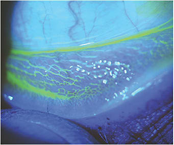 This photo shows an excellent example of follicular conjunctivitis. This individual presented with a recent history of unilateral ocular irritation and injection that eventually became bilateral. He complained of mild photophobia and discomfort. Palpation of his preauricular nodes revealed moderate tenderness. In addition to the obvious follicular changes, he had grade 1 corneal fluorescein staining. Our initial diagnosis was bilateral follicular conjunctivitis.