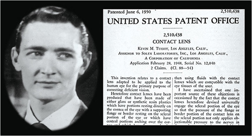 Enter Kevin M. Touhy, who in most historical references is given credit for the first corneal lens. In 1945, Tuohy left Obrig Laboratories in Montreal to join Solon Braff, OD, and lab manager Xavier Villagran at Los Angeles-based Solex Laboratories (Pearson, 2022). The next year Villagran showed Dr. Braff and Obrig the center of a scleral lens that he had inadvertently cut out. Tuohy refined the production of the 11.5mm to 12.0mm PMMA lenses. Then, on Feb. 28, 1948, Tuohy submitted a patent application, listing himself as the single inventor (Figure 1) (Tuohy, 1948). As history would have it, this patent (thanks to a more lenient patent reviewer) was officially granted on June 6, 1950 (Bowden, 2009).