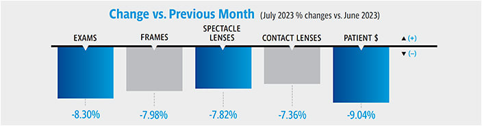 Here, we share July 2023 practice data reported by GPN on Aug. 7. Compared to June 2023, July saw decreases in all categories. However, July of this year compared to July 2022 saw slight decreases in frames, spectacle lenses, and contact lenses; exams and patient payments were slightly up.
