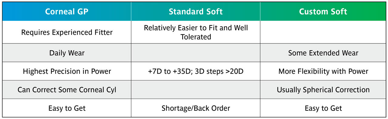 Hyper-Dk materials should be used to reduce oxygen stress accompanied by a low fluid reservoir to optimize oxygen transmission. Michaud and colleagues have recommended a > 150 Dk material, ≤ 250-micron center thickness, and ≤ 200-micron central clearance.8 Other options could include a corneal GP lens or a partial thickness corneal transplant followed by a scleral lens fitting.