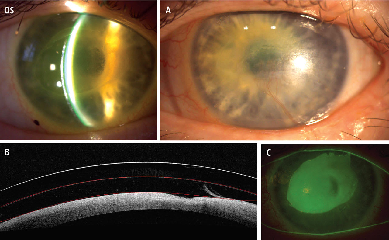 The challenge with SLs for NK lies not in the fit itself, but in the follow-up necessary in the ensuing days and weeks to monitor for complications and ensure that the patient is not regressing. Practitioners may consider epithelial debridement of the PED in patients in whom the edges of the defect become suspended within the posterior lens chamber with SL wear (Figure 5). This may allow for better re-epithelialization.
