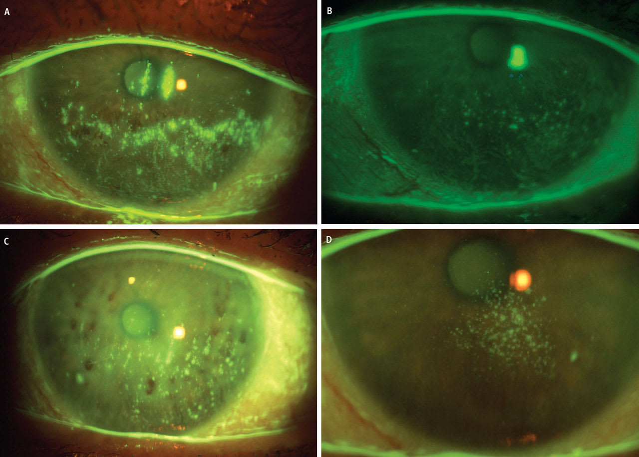 To ensure that no opportunistic infections (e.g., microbial keratitis [MK]) occur with epitheliopathy, it is important to use prophylactic topical fourth-generation fluoroquinolones with any extended contact lens use. Figure 4 illustrates a patient who has mild stage 2 NK that worsened due to poor adherence to preservative-free artificial tears and PRP drops. A BCL and topical antibiotic were added, and signs quickly improved after one week of use.